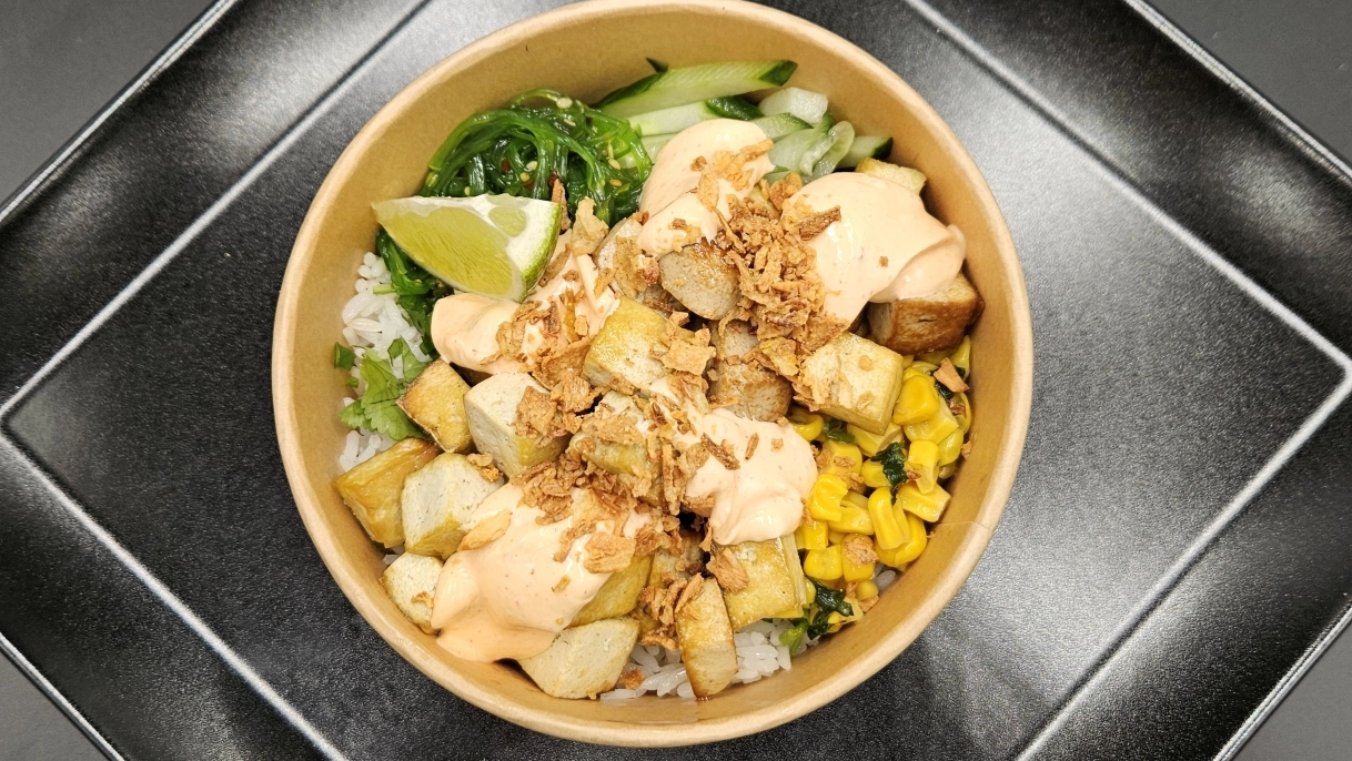 korianderes jázminrizs, tépett szójás tofu, kukorica, uborka, wacame, algassaláta, spicy majonéz, pirított hagyma, lime